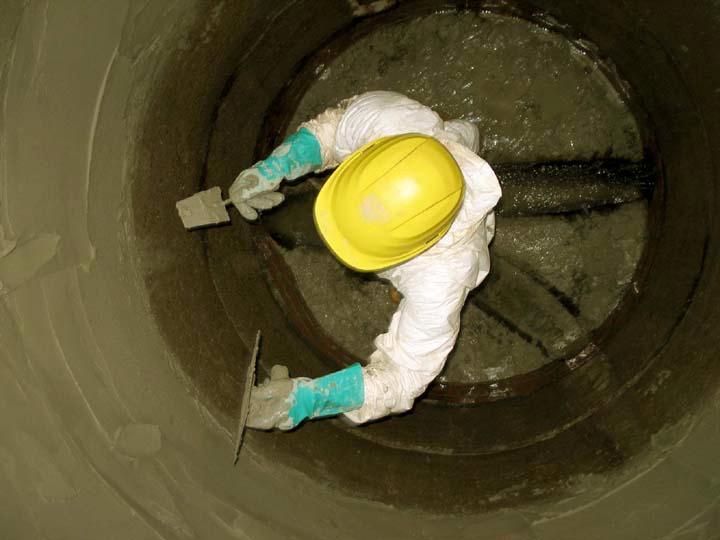 Die Schachtwände wurden mit einem Wasser-Sand-Gemisch im Hochdruckstrahlverfahren grundgereinigt, bevor man loses, korrodiertes Fugenmaterial bis zu 3 cm tief ausräumte und die Fugen mit abwasserfestem Mörtel neu aufarbeitete. Die meisten Schächte wurden anschließend mit einem Kanalmörtelsystem oberflächenbeschichtet.