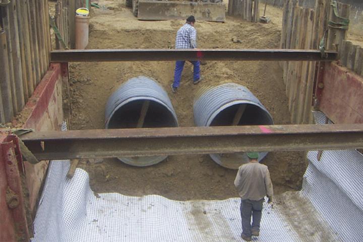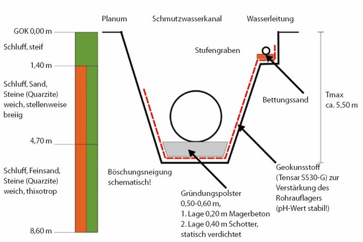 Der Einbau der Geogitter-Vliesstoff- Kombination vom Typ Tensar SS30-G in Zusammenhang mit einem Gründungspolster unter Kanal- und Leitungsrohren hat sich nachweislich bewährt.