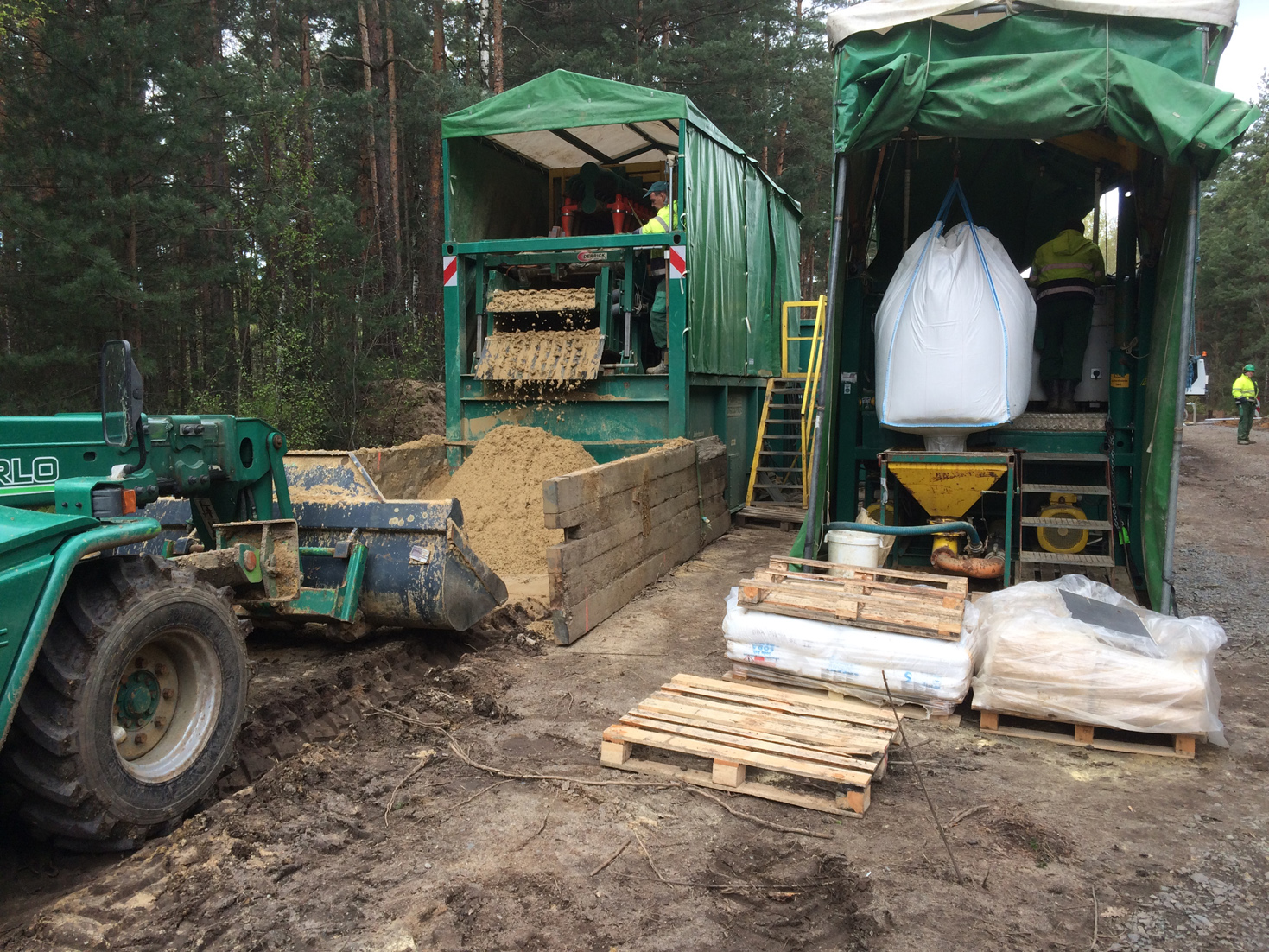 Infolgedessen hatte das Haushalten mit den Spülungsmengen oberste Priorität. Daher wurde entschieden, die gesamte Bohrspülung, welche bei der Maßnahme anfiel, aufzubereiten und im Kreislauf zu fahren. Das bedeutete, dass die mit Bohrklein beladene Bohrspülung, welche bei den Kleinbohranlagen anfiel, mittels Tankwagen zu den Großanlagen transportiert wurde, um sie in den dort installierten Recyclingsystemen aufzubereiten.