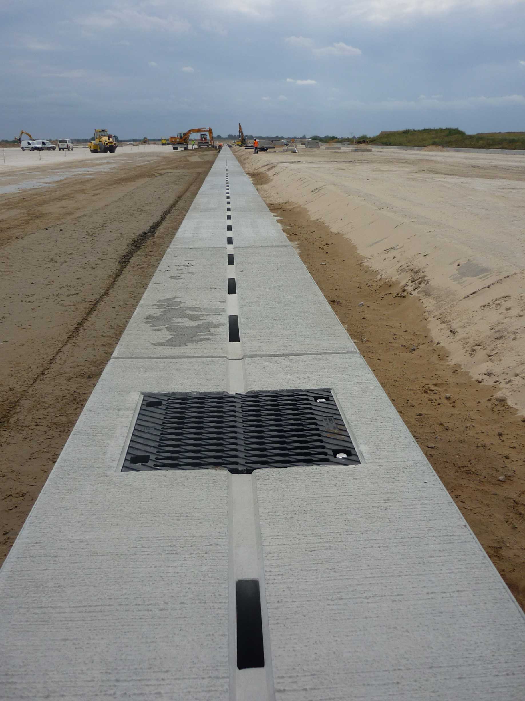 Schlitzrinnen zeichnen sich gegenüber anderen Rinnentypen dadurch aus, dass sie keine durchgängig aufmontierten Gitterabdeckungen tragen und folglich die verschleißanfällige Materialverbindung zwischen Rinne und Abdeckung entfällt. Lediglich an einem Ende der Rinnenelemente kann sich eine kleine Reinigungs- und Inspektionsöffnung befinden, die eine schwerlastbefahrbare Abdeckung trägt. Schlitzrinnen werden nach aktuellem Produktionsstandard aus stahlbewehrtem Beton vollständig in einem Stück gegossen. Sie sind somit frei von korrosionsanfälligen Nähten und Fugen. Gleichzeitig bedingt die monolithische Herstellungsweise, dass die Rinnen insbesondere dynamischen Horizontalkräften problemlos Stand halten.