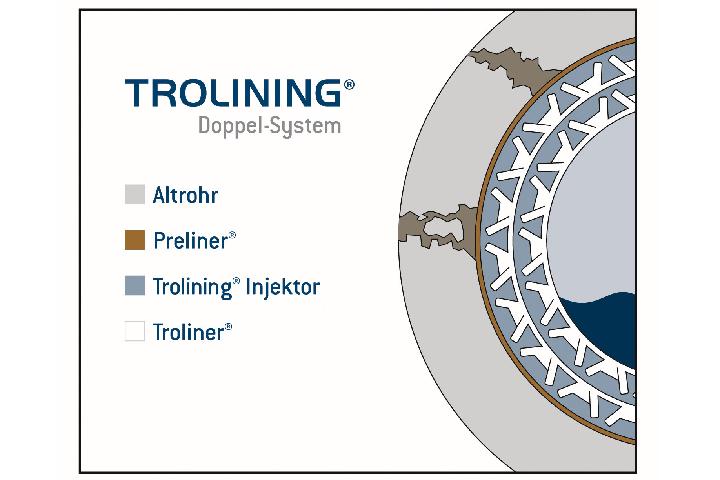 Beim Noppenschlauchverfahren handelt es sich um den Verbund einer oder mehrerer zu einem Schlauch bzw. Liner verschweißten PE-HD Noppenbahn(en) und einem hochfesten Injektionsmörtel, welcher für die statische Tragfähigkeit sorgt. Beide Komponenten ergänzen sich in ihren positiven Eigenschaften und bilden zusammen ein dünnwandiges, aber dennoch außerordentlich tragfähiges Rohr-im-Rohr Verbundsystem. Weiterhin gewährleistet das TROLINING-System verbesserte Fließeigenschaften und eine extrem hohe chemische Resistenz.