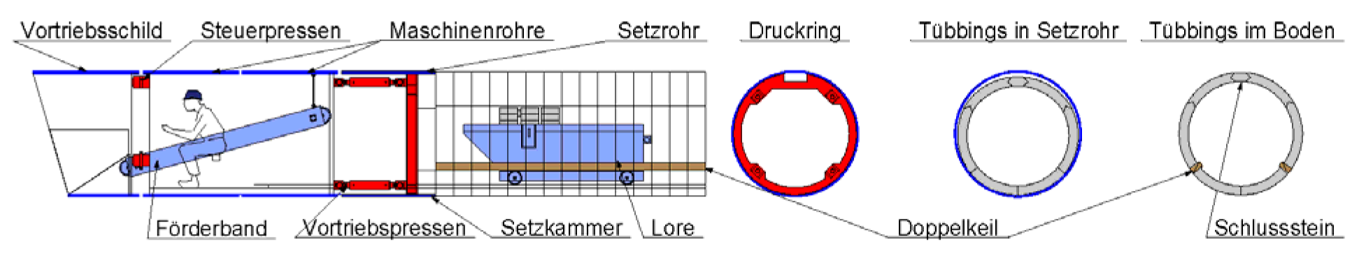 Mit den Hydraulikpressen wird das Vortriebsschild in den Boden vorgetrieben. Dabei drückt es sich mit dem Druckverteilungsring anfangs an der Rückwand der Startbaugrube und dann an dem zuletzt eingebauten Tübbingausbauring ab. Weil das Vortriebsschild abgeschrägt ist und dem Abbau vorauseilt, entsteht an der Ortsbrust eine jederzeit standsichere Böschung. Der Boden wird mit einer Teilschnittmaschine oder händisch abgebaut und über Förderband und Lore aus dem Tunnel befördert. Im Schutz des Vortriebsschildes können Hindernisse beseitigt werden. Beim Überfahren vorhandener Kanäle werden Altrohr und Anschlussleitungen an der Ortsbrust abgebrochen und an eine provisorische Abwasserleitung im Stollen angeschlossen.