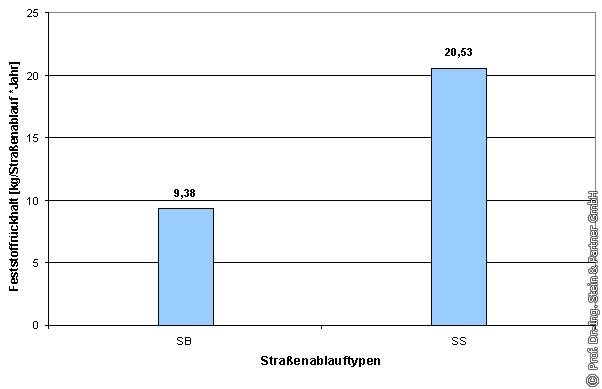 2.1 Feststoffrückhalt von SB und SS Straßenabläufe haben die Aufgabe, den Straßenabfluss aufzunehmen und abzuleiten und dabei zugeführte grobe Feststoffe, wie Sand und Kies, Winterstreugut, Laub, Zigarettenkippen und sonstigen Abfall zurückzuhalten. Der Feststoffrückhalt erfolgt beim SB (Straßenablauf mit Bodenauslauf ) durch den Einsatz eines Eimers und beim SS (Straßenablauf mit Schlammraum) durch den als Absetzbecken fungierenden Schlammraum. Im Bild 1 ist der durchschnittliche Feststoffrückhalt der Straßenabläufe SB und SS gegenübergestellt. Dabei kann festgestellt werden, dass der Feststoffrückhalt beim SS gegenüber dem SB doppelt so groß ist.