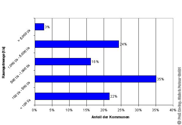 Die in den Entwässerungsnetzen anfallende Räumgutmenge schwankt in Abhängigkeit der Kommune zwischen < 100 t/a und > 5000 t/a (s. Bild 2). Die durchschnittlich anfallende Räumgutmenge in Deutschland beträgt ca. 900 t/Jahr bzw., bezogen auf 1 km Kanal, ca. 0,77 t/Jahr·km. Bei der Befragung konnten 43% der Kommunen keine Angaben zu diesem Punkt machen.