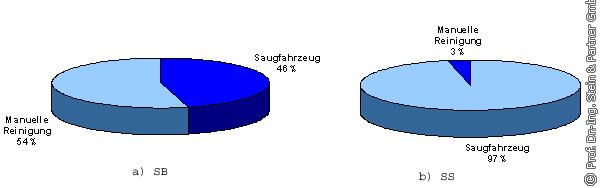 Beim SB wird die Reinigung des Eimers per Hand zu 54% und per Saugfahrzeug zu 46% ausgeführt (s. Bild 6a). Beim SS kommt das Saugfahrzeug zu 97% zum Einsatz. In seltenen Fällen wird manuell nachgereinigt (s. Bild 6b).
