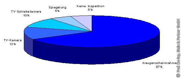 3.1.1 Inspektionsverfahren und -technik Art und Anteil der zur Inspektion von Straßenablaufsystemen in der Praxis eingesetzten Verfahren sind im Bild 8 dargestellt. 12 Kommunen machten keine Angaben. Die meisten Kommunen (67%) inspizieren durch eine Inaugenscheinnahme, da diese das einfachste und kostengünstigste Verfahren darstellt. Dabei können jedoch nur grobe Schäden im Bereich der Straßenoberfläche und im oberen Bereich des Korpus erfasst werden, so dass keine eindeutige Aussage über die Dichtheit des Straßenablaufes (SB) bzw. über die Dichtheit des wasserfreien Korpus oberhalb des Schlammraumes (SS) gemacht werden kann.