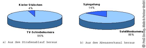 Die Anschlusskanäle werden sowohl über die Straßenabläufe als auch über die öffentlichen Abwasserkanäle inspiziert (s. Bild 9). Bei der Inspektion mit der TV-Schiebekamera aus dem Straßenablauf heraus haben 96% der Kommunen gute Erfahrungen gemacht. Aus dem Abwasserkanal heraus wird überwiegend die TV-Satellitenkamera eingesetzt (86%). In einigen Fällen (14%) erfolgt die Inspektion der Anschlusskanäle auch durch Spiegelung aus dem Abwasserkanal heraus.