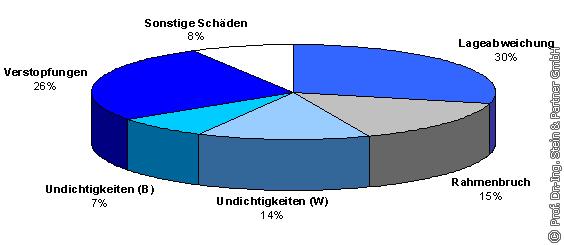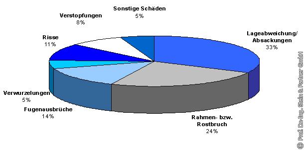 3.1.3 Schadensarten bei Straßenabläufen Die Umfrage hat ergeben, dass die häufigsten Schäden bei Straßenabläufen Lageabweichungen des Aufsatzes (30%) und Verstopfungen (26%) sind (s. Bild 10). Diese beiden Schadensarten bilden 56% der gesamten Schäden an Straßenabläufen. Mit einem Anteil von 15% folgen Rahmenbrüche sowie Undichtigkeiten im Wandbereich (W) mit 14% und Undichtigkeiten im Bodenbereich (B) mit 7%.