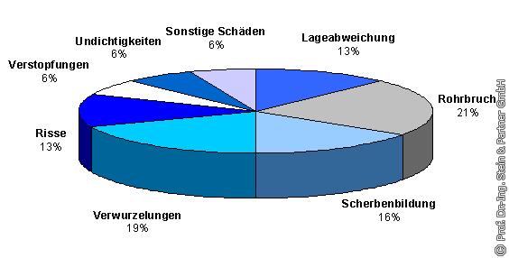 Hauptanlässe für die Einleitung von Sanierungsmaßnahmen am Anschlusskanal sind Wurzeleinwüchse (20%) und Verstopfungen (17%) sowie Rohrbrüche bzw. Einstürze der Rohre (19%) (s. Bild 15). In diesen Fällen besteht sofortiger Handlungsbedarf (Feuerwehrstrategie), um die Funktionsfähigkeit des jeweiligen Straßenablaufsystems wieder herzustellen und ggf. Folgeschäden an der Fahrbahn zu beseitigen.