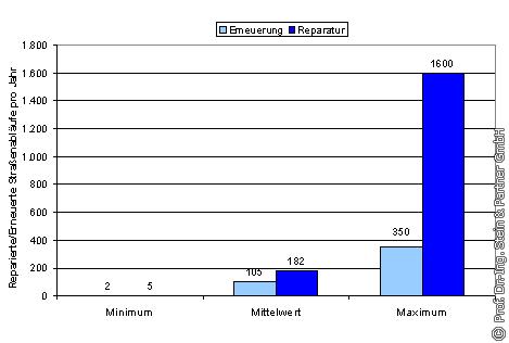 3.2.5 Anzahl und Kosten für Reparatur/Erneuerung von Straßenabläufen Die Anzahl eingeleiteter Reparaturen und Erneuerungen von Straßenabläufen ist jeweils stark abhängig von der Größe der Kommune bzw. der Anzahl der installierten Straßenabläufe. Pro Kommune und Jahr werden im Mittel 182 Straßenabläufe repariert und 105 erneuert (s. Bild 23). Die Minimalanzahl durchgeführten Reparaturmaßnahmen beträgt 5 und die Maximalanzahl 1600 Straßenabläufe pro Jahr. Bei den eingeleiteten Erneuerungsmaßnahmen liegt das Minimum bei 2 und das Maximum bei 350 Straßenabläufen pro Jahr.