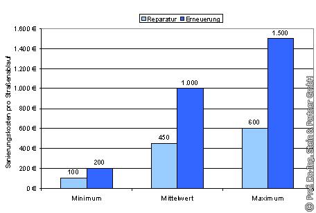 Laut Angaben der Netzbetreiber weisen im Mittel 15% der Straßenabläufe Schäden auf. Übertragen auf die gesamte Bundesrepublik bedeutet dies, dass ca. 2,2 Mio. Straßenabläufe schadhaft sind. Dabei entfallen ca. 1,2 Mio. sanierungsbedürftiger Straßenabläufe auf den Typ SB und 1,0 Mio. auf den Typ SS. Pro Jahr werden etwa 95.000 schadhafte Straßenabläufe saniert. Das Verhältnis der bisher in der Praxis realisierten Reparatur- und Erneuerungsmaßnahmen beträgt 48% (Reparatur) zu 52% (Erneuerung). Die mittleren Kosten für die Reparatur belaufen sich auf ca. 450 €/Straßenablauf und die einer Erneuerung auf ca. 1.000 €/Straßenablauf. Insgesamt ergibt sich, bezogen auf die oben geschätzten 2,2 Mio. schadhafter Straßenabläufe, ein Gesamtsanierungsbedarf von 1,63 Mrd. €. In diesen Kosten sind aufgrund fehlender Angaben die Aufwendungen für die Sanierung schadhafter Anschlusskanäle nicht enthalten.