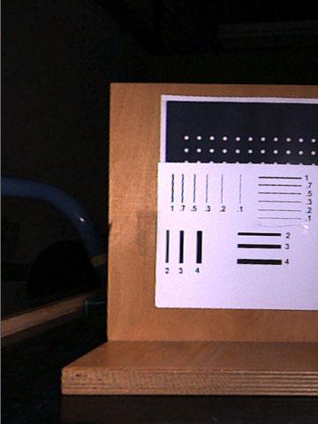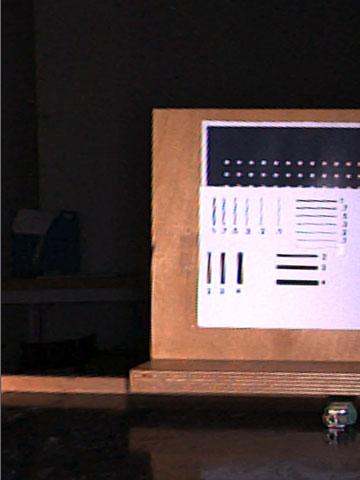 Am 18.10.2005 wurden bei der Fa. IBAK im Beisein eines Vertreters von S&P mit PANORAMO PLUS verschiedene Tests zur Verdeutlichung des Schärfegewinns der perspektivischen Bildaufnahmen bei Verwendung der ColorPlus-Software durchgeführt. Bild 4 zeigt diesbezügliche Testbildaufnahmen ohne (Bild 4a) und mit zugeschalteter ColorPlus-Funktion (Bild 4b) zum Vergleich. Die Erkennbarkeit von Rissen wurde und wird seit Einführung des PANORAMO-Inspektionssystems teilweise kontrovers diskutiert. Die Fa. IBAK gibt als untere Sichtbarkeitsgrenze für Rissbreiten 1/10.000 oder 0,01% des Rohrinnendurchmessers an. Das würde beispielsweise für ein Rohr der Nennweite DN/ID 500 (500 mm) bedeuten, dass Risse bis zu einer Breite von B = 500 mm/10.000 = 0,05 mm erkannt werden könnten. Auch zu diesem Thema wurden am 18.10.2005 Untersuchungen im Rahmen der Überprüfung der Bildqualität durchgeführt. Dabei wurden aus den Entfernungen 10, 25, 40 und 50 cm mit PANORAMO PLUS Aufnahmen von Linien unterschiedlicher Breite gemacht (Simulation der Rohrnennweiten DN/ID 200, 500, 800 und 1000). Hierfür wurde ein vertikal aufgestelltes Holzbrett mit aufgeklebtem Papier mit weißem (100% Kontrast: Schwarz auf Weiß) bzw. grauem Hintergrund (50% Kontrast: Schwarz auf Grau) parallel zum Inspektionssystem (Simulation einer Rohrwand) in Höhe der Linse ausgerichtet. Die Papierseiten waren jeweils mit aufgedruckten schwarzen Linien mit unterschiedlichen Strichdicken (Angabe in mm) sowie unter der 0,1 mm Linie zusätzlich mit einem aufgeklebten Menschenhaar (ca. 0,06 mm) versehen.