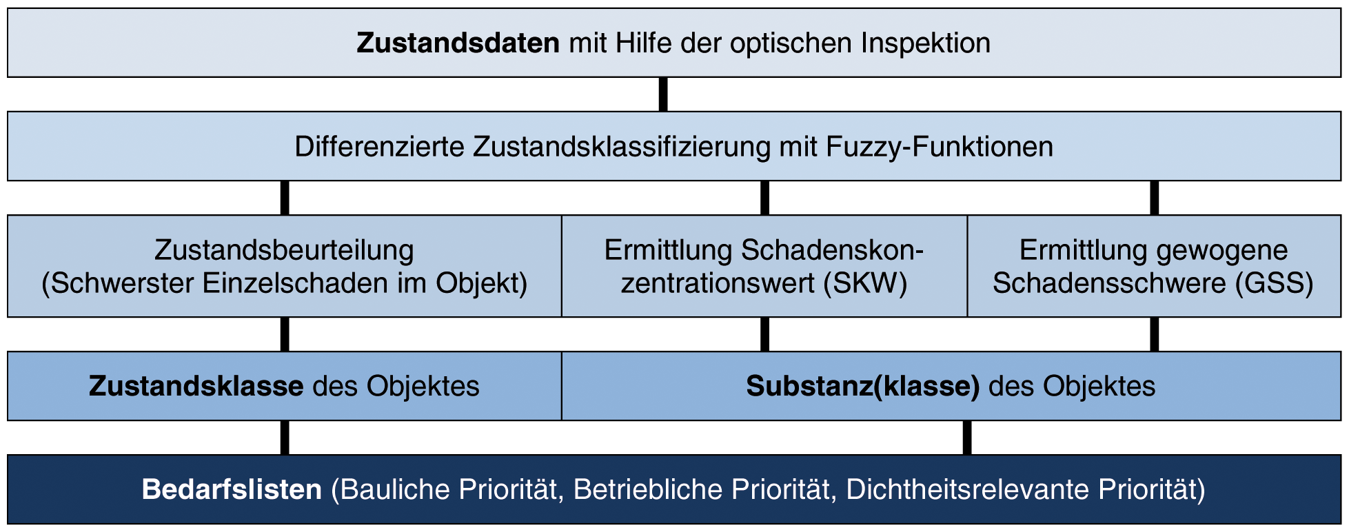 Die ingenieurmäßige Beurteilung des baulichen / betrieblichen Zustandes des Entwässerungssystems war unterteilt in die Arbeitsschritte Zustandsklassifizierung, -bewertung und -beurteilung unter Berücksichtigung der gestellten Anforderungen bzw. Schutzziele sowie der maßgeblichen Einflussfaktoren und Randbedingungen. Die Zustandsklassifizierung definiert DWA-Merkblatt 149 Teil 3 [7] als „Einstufung der Ergebnisse der Inspektion durch Vergleich mit den gestellten Anforderungen“. Bei der Einstufung jedes einzelnen Schadens wurden die Stammdaten des Objektes (Haltung) mit den Zustands-/Schadensbeschreibungen verknüpft und mindestens die Schadensart sowie das Schadensausmaß ausgewertet.