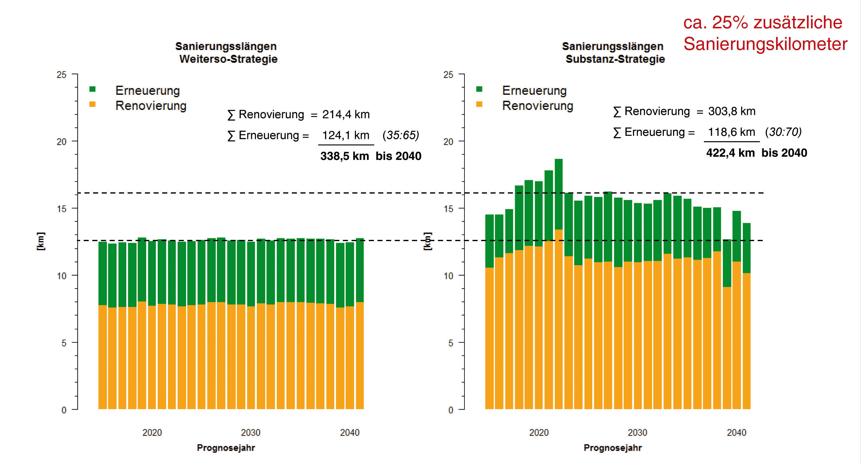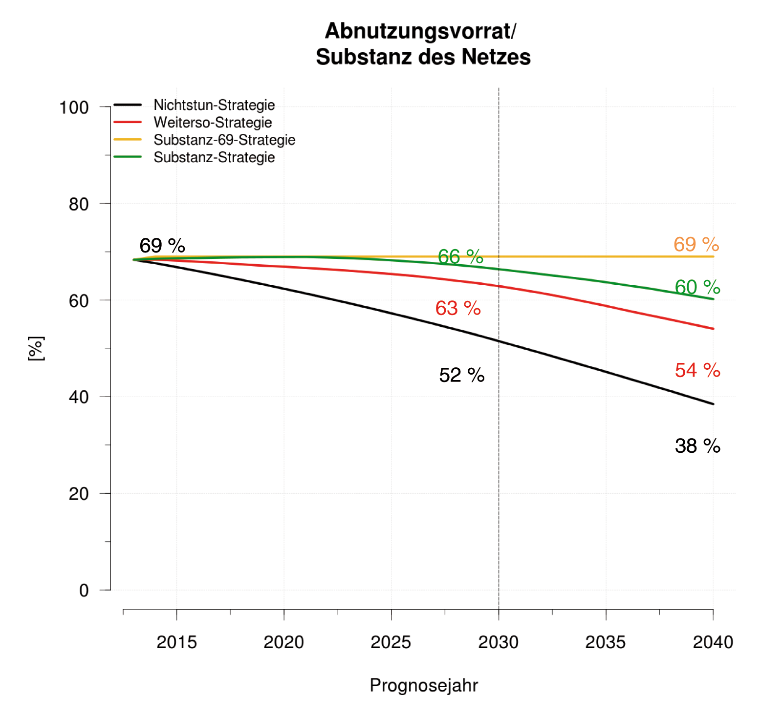 Die alternativ zur „Weiterso-Strategie“ entwickelte „Substanz-Strategie“ führt zu einem Substanzverzehr von 3 % bis 2030 und von 9 % bis 2040.