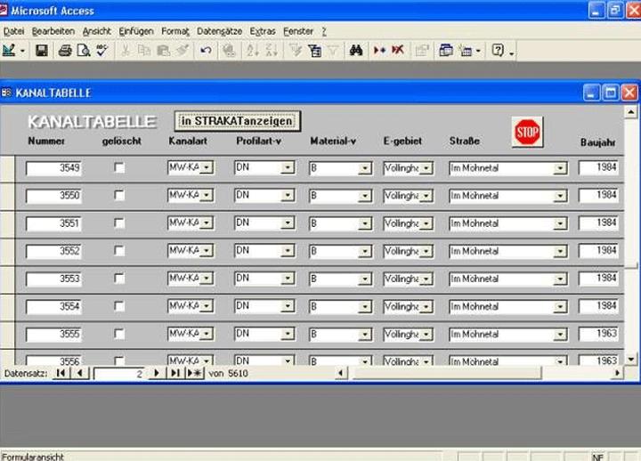 Das GIS besteht aus einer graphischen Oberfläche und einer angebundenen Datenbank (z.B. Access, Oracle usw.), in der alle Haltungsparameter, wie Nennweite, Werkstoff, Haltungslänge, Gefälle, Zustandsbilder usw. hinterlegt sind. Hier wurden zusätzlich die erfassten Netz- und Ablagerungsdaten integriert, verwaltet, analysiert und visualisiert, z.B. durch farbliche Darstellung der verschiedenen Ablagerungsklassen. Unter Nutzung aller o.a. Informationen war es möglich, die zu reinigenden Haltungen eindeutig zu identifizieren und für alle Haltungen den optimalen Reinigungszyklus festzulegen. Die Bandbreite der Zyklen schwankte zwischen jährlich zu reinigenden Haltungen und Netzbereichen, die erst im Vorlauf zur nächsten TV-Inspektion (gemäß SÜwVKan-NRW nach 15 Jahren) gespült werden müssen.