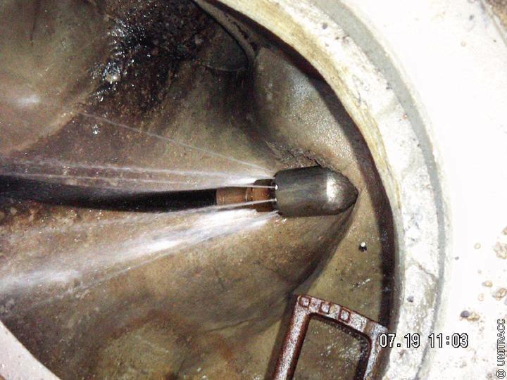 Im Schritt 3 erfolgt die zuvor im Schritt 2 geplante Reinigung. Dabei wird das Fahrzeug so nah wie möglich an den Startschacht heran gefahren. Die Einsatzstelle wird gesichert und die Beanspruchung des Verkehrsraumes auf das Nötigste reduziert. Mit dem Einbringen des Schlauches und der Düse in den Schacht erfolgt die Reinigungsdurchführung. Bei den Reinigungsarbeiten ist zu beachten, dass die o.g. Reinigungsparameter auch auf den baulichen Zustand der jeweiligen Haltung anzupassen sind, um eine Schadensausweitung bei bereits vorgeschädigten Kanälen (z.B. Abrieb, Korrosion, Risse, Scherbenbildung, Rohrbruch) bis hin zum Einsturz durch die Reinigung zu verhindern (Bild 9a). Besondere Gefahrenmomente ergeben sich durch das Schlagen der Reinigungsdüse, das Aufwirbeln von Sediment oder Steinen sowie das Verharren der Reinigungsdüse an einer Stelle (Bild 9b).