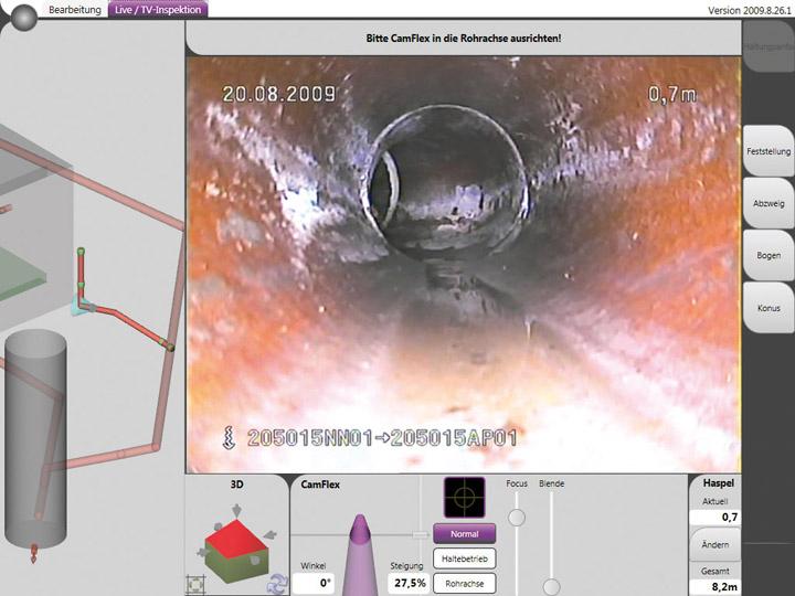 Entscheidendes Merkmal dieses Systems ist die Kamera CamFlex, die speziell für die Untersuchung von Grundleitungssystemen von DN100 bis DN200 entwickelt wurde und innerhalb des Leitungssystems in Seitenabzweige abbiegen kann – wenn nötig, auch mehrfach hintereinander. So können weit verzweigte Systeme prinzipiell komplett bis zu den Einleitungsstellen untersucht werden. Die navigierbare Kamera ist eine Weiterentwicklung der weit verbreiteten Kummert-Schiebekameras.