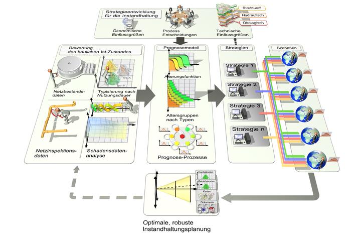 "STATUS Kanal" als lernendes und kalibrierbares Netzmanagementsystem ermöglicht eine ganzheitliche Instandhaltungsplanung, in der Inspektion und Sanierung optimal aufeinander abgestimmt sind [3]. Durch Prognosen, Strategien und Szenarien lassen sich die Instandhaltungsentscheidungen auf einer sicheren Grundlage treffen, was in der Folge zu optimaler Budgetallokation, Effizienzsteigerung und Risikominimierung führt. Die Netzanalysen auf der Basis von "STATUS Kanal" erfolgen in einem mehrstufigen Prozess: