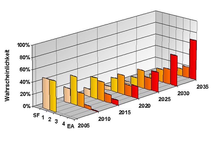 Im Bild 8 ist die Prognose der Substanzentwicklung für die Beispielhaltung in Fünf-Jahres-Schritten veranschaulicht. Die Anfangsverteilung stellt die heutige Substanzwertverteilung dar (vorderste Balkengruppe). Die Wahrscheinlichkeit eines Ausfalls (EA Balken) steigt kontinuierlich. Im Jahr 2035 befindet sich die Haltung mit einer Wahrscheinlichkeit von 12% bzw. 18% in den Substanzklassen "SBK 3" bzw. "SBK 4", während das Risiko eines endgültigen Ausfalls bereits 67% beträgt.
