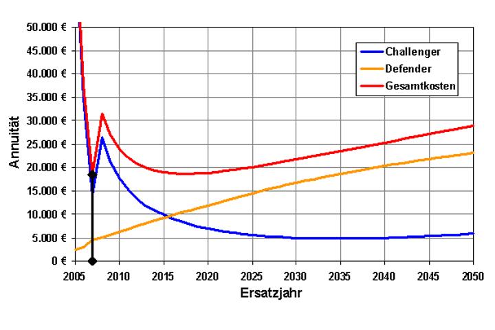 Das Replacement-Modell ermittelt auf dieser Grundlage den Zeitraum innerhalb dessen die Summe der Kostenannuitäten aus Defender und Challenger ein Minimum ergibt (Bild 10).