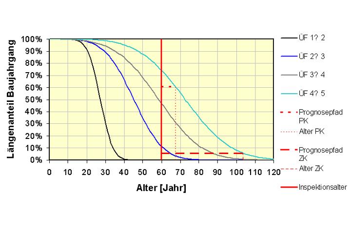 Anhand von statistischen Auswertungen von Inspektionsbefunden werden die unterschiedlichen Verweilzeiten in den einzelnen Zustands- bzw. Substanzklassen ermittelt. Die Übergangswahrscheinlichkeiten in die nächst schlechtere Zustands- bzw. Substanzklasse sind dabei vom betrachteten Zeitpunkt und dem damit verbundenen Alter der untersuchten Haltung abhängig. Dieser Sachverhalt findet seinen Niederschlag darin, dass für den Übergang von einer Zustands- bzw. Substanzklasse zur nächsten jeweils altersabhängige, haltungs- und netzspezifische Überlebenswahrscheinlichkeiten angesetzt werden.