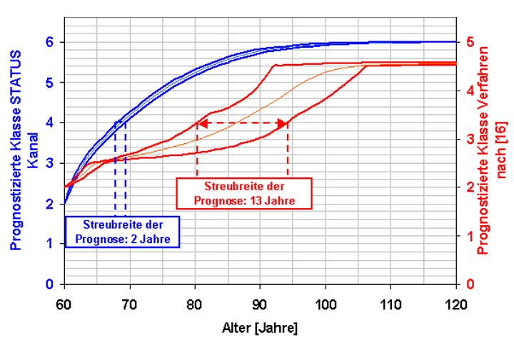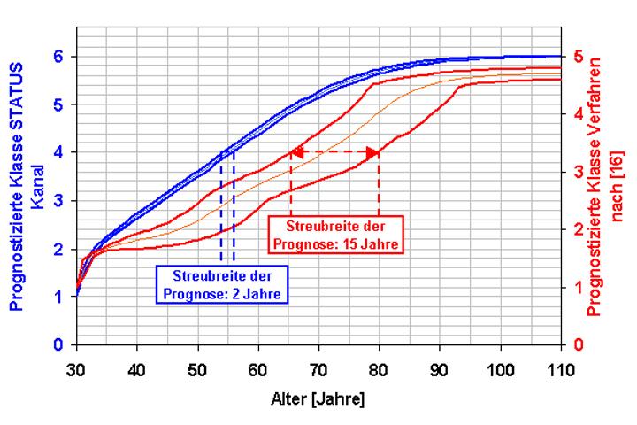 Bei den parallel mit den selben Daten durchgeführten Prognoseläufen des Modells "STATUS Kanal" liegt die Streuung des Alterungsverhaltens der Kontrollgruppe im Bereich der Streuung der Ausgangsdaten, was die Stabilität des verwendeten Prognosemodells bestätigt. Darüber hinaus werden durch die beiden Modelle unterschiedliche Alterungsverläufe generiert, die im Ergebnis zu unterschiedlichen Aussagen hinsichtlich der technischen Nutzungsdauern führen.