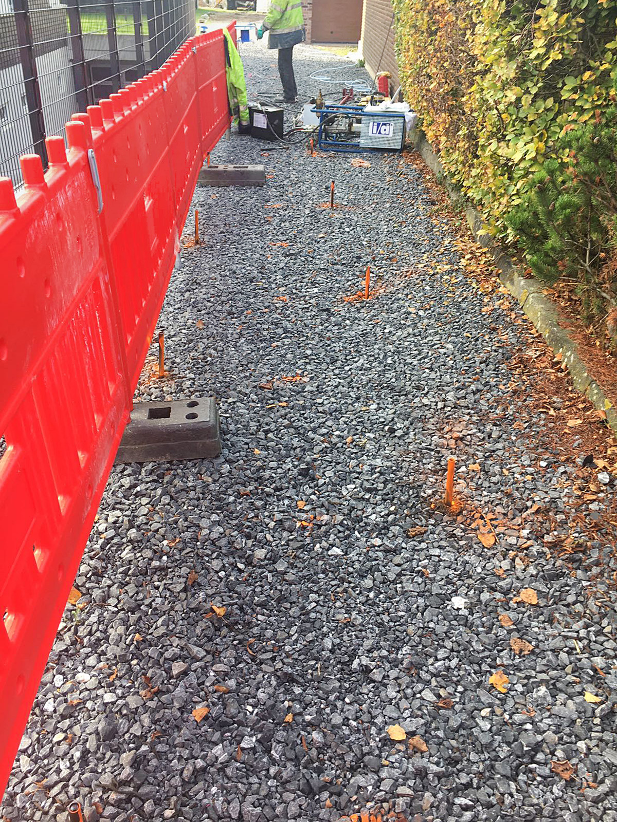 Die Arbeiter treiben die fünf Millimeter starken Rohre (Aussendurchmesser 21 mm) mit Rammblock und Rammhammer in den Boden. Auf einer Breite von etwa zwei Metern mittig über der geplanten Vortriebsachse und damit beidseitig etwa 0,75 Meter neben der geplanten Rohrwandung schlagen sie die Rammlanzen von der Geländeoberfläche aus bis in eine Tiefe von etwa -3,80 m bis -4,80 m unter GOK ein.