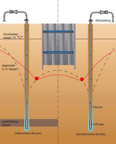 Grundwasserabsenkungen permanenter Art, z.B. in Bergschadensgebieten mit flächigen Geländeabsenkungen und dadurch zu hoch anstehendem Grundwasser, oder Grundwasserabsenkungen vorübergehender Art, z.B. für die Errichtung tiefer Baugruben oder großer Abwasser-Leitungsgräben, offener Tunnelstrecken oder für Tagebaumaßnahmen, werden derzeit noch überwiegend durch eine Vielzahl von kürzeren, vertikalen Förderbrunnen vorgenommen. Diese sehr aufwendige Bauweise kann in vielen Fällen ebenfalls durch horizontalbohrtechnisch verlegte Filterbrunnen ersetzt werden.