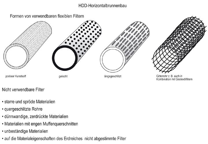 Brunnenfilterrohre sind nahezu immer anspruchsvoller gebaut, ihre Verlegung im geschlossenen Schutzrohr oder im Gitterrohr ist ratsam. Bei flachen HDD-Biegeradien für die Anfahrstrecken zum Brunnenbetriebsniveau können nahezu alle Brunnenfilterarten ins Erdreich verlegt werden. Stehen nur kurze Anfahrstrecken mit starkem Krümmungsradius zur Verfügung, so sind flexible Filtermaterialien auszuwählen, z.B. PE-Granulat-Filter, Gittergewebefilter und z.B. gewisse Lochfiltertypen. Bei Einbringen sehr starrer Filter sind die Filterstrangbereiche in Einzelsegmente zu untergliedern, die mit flexiblen kurzen Rohrsegmenten untereinander verbunden werden.