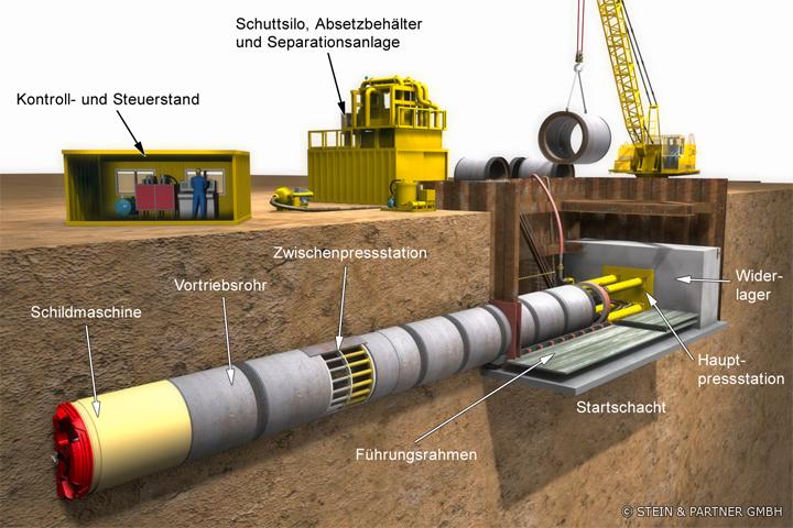 Bei diesem Verfahren werden von einem Startschacht aus mit Hilfe einer Pressstation und ggf. unter Zuhilfenahme von Zwischenpressstationen vorgefertigte Vortriebsrohre durch den Baugrund bis in einen Zielschacht vorgetrieben (Bild 1). Eine Schildmaschine, die dem ersten Rohr vorgeschaltet ist, ermöglicht den Vortrieb in gerader oder gekrümmter Linienführung. An der Begrenzungsfläche in Vortriebsrichtung, der sogenannten Ortsbrust, wird der anstehende Boden abgebaut und durch den vorgetriebenen Rohrstrang nach über Tage abgefördert. Die Vortriebsrohre stützen dabei dauerhaft den aufgefahrenen Hohlraum und stellen nach Abschluss der Vortriebsarbeiten i.d.R. auch das endgültige Leitungsbauwerk dar.