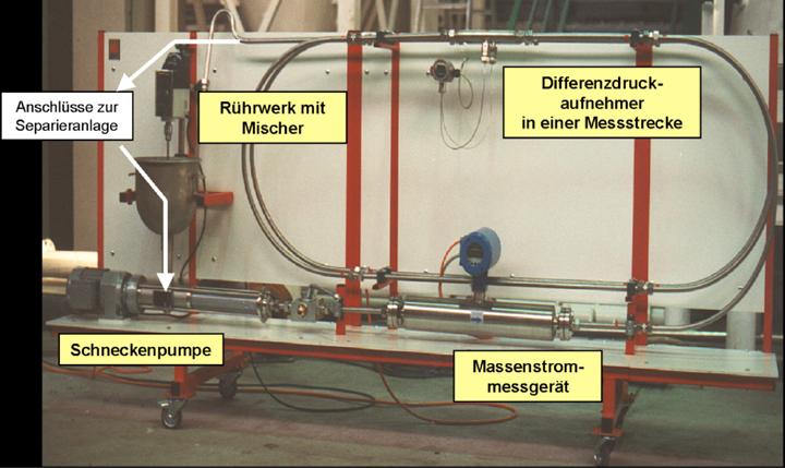 Die Untersuchungen wurden in zwei Versuchsständen durchgeführt. Beim 1. Versuchsstand (Bild 7) wurde im kleineren, idealisierten Maßstab der Suspensionskreislauf einer Schildmaschine mit flüssigkeitsgestützter Ortsbrust simuliert.