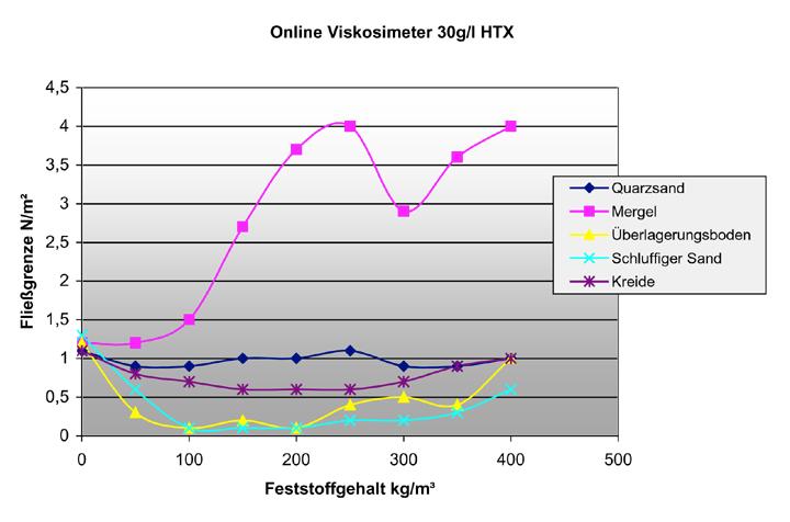 Die umfangeichen Laboruntersuchungen lieferten den Beweis, dass sich die mit dem DMT-Online-Viskosimeter online gemessenen Fließgrenzenkurven der unterschiedlichen Stützflüssigkeitsgemische in Abhängigkeit von Bentonitsorte, Bentonitkonzentration, Feststoffgehalt sowie Bodenart eindeutig reproduzieren lassen, d.h. jede Versuchssuspension wies eine für sie charakteristische Fließkurve auf, welche darüber hinaus mit den Fließgrenzenergebnissen der Kugelharfe korreliert.