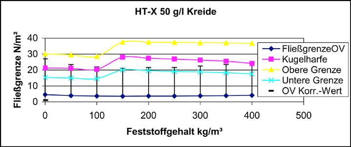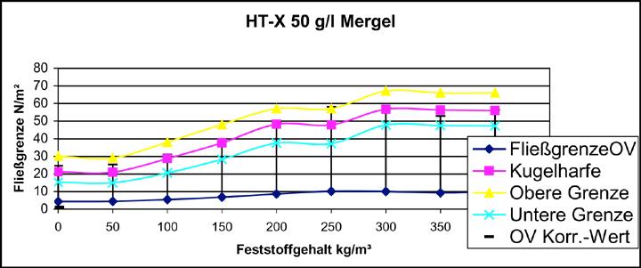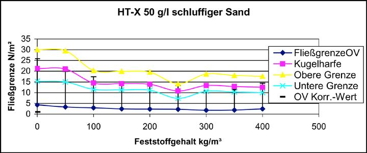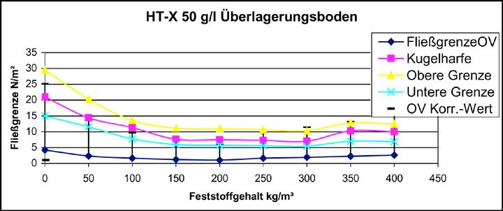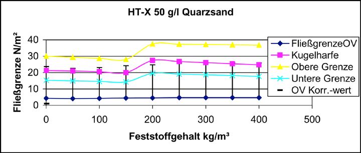 Im Bild 10 sind beispielhaft die Ergebnisse der OV- und Kugelharfen-Fließgrenzen für die Bentonitsorte Ibeco HTX 50 g/l dargestellt. Für die mit der Kugelharfe ermittelten Werte wurde aus Genauigkeitsgründen jeweils ein sogenanntes Kugelharfenfließgrenzenintervall ermittelt, d.h. es wurde neben der kritischen Fließgrenze, bestimmt durch die größte auf der Suspensionsoberfläche aufliegende ("schwimmende") Kugel, auch die Fließgrenzen für die nächstgrößere bzw. kleinere Kugel angegeben. Bei Betrachtung der Kurvenverläufe fällt auf, dass die OV- und Kugelharfen-Fließgrenzenverläufe tendenziell gleich sind, sich jedoch bezüglich ihrer Größe unterscheiden. Die mit dem OV festgestellten und errechneten Werte sind erheblich geringer, als die mit der Kugelharfe ermittelten, lassen sich jedoch mit Hilfe einer errechneten Korrelationsfunktion auf das Niveau der Kugelharfenwerte anheben. Für die Versuche mit dem Bentonit HT-X und einer Bentonitkonzentration von 50 g/l betrug die Korrelationsfunktion z.B. f(χn) = 4,5χn ± 2.
