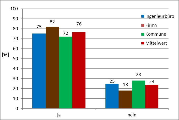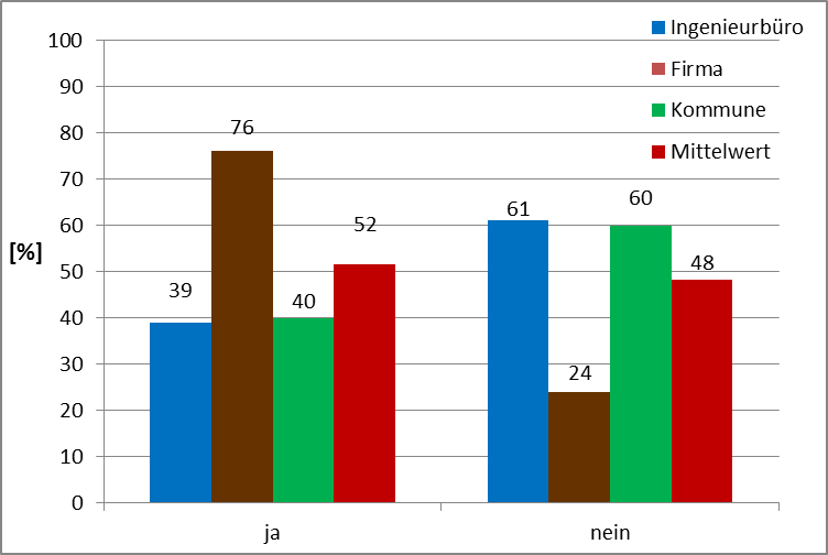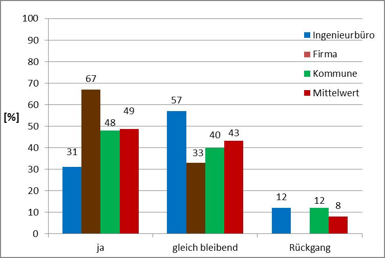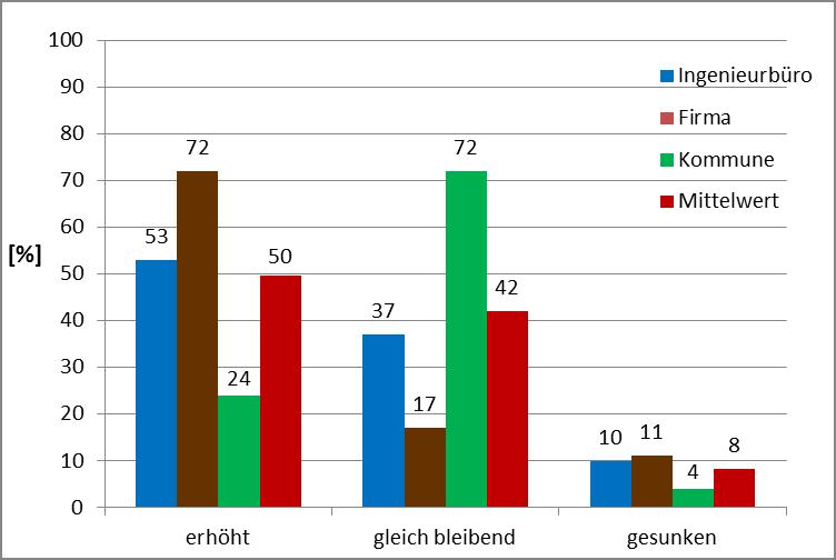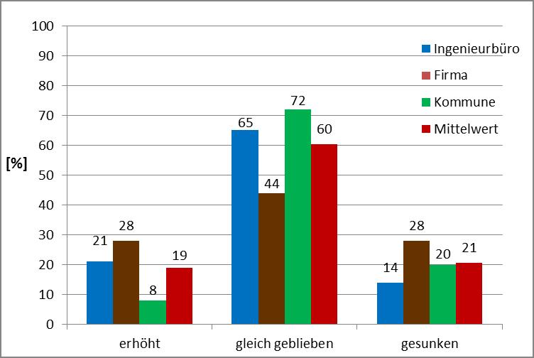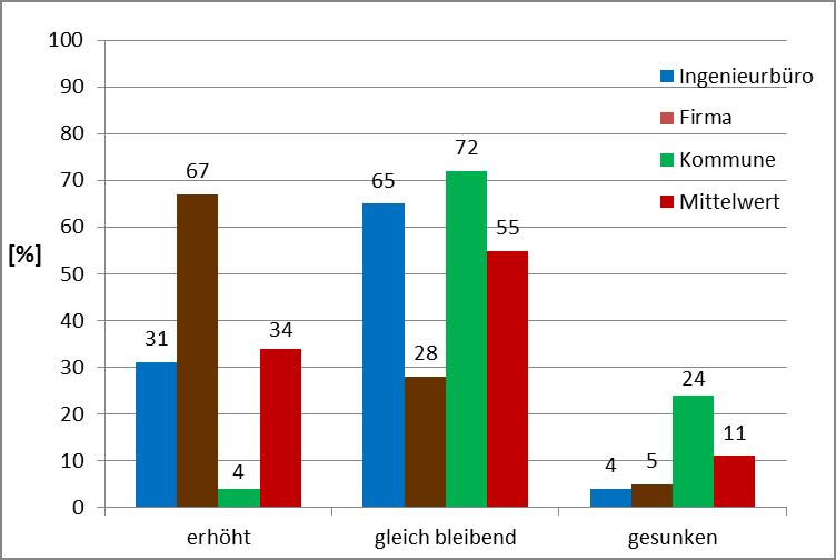Weniger überraschend ist, dass die Vergütung seitens der Ingenieurbüros und Sanierungsfirmen schlechter beurteilt wird als seitens der Kommunen. Die Sanierungsfirmen sehen hierbei auch eine Verschlechterung gegenüber dem Vorjahr. Die Gewinn- bzw. Preissituation wird dagegen von allen drei Gruppen als konstant beurteilt.