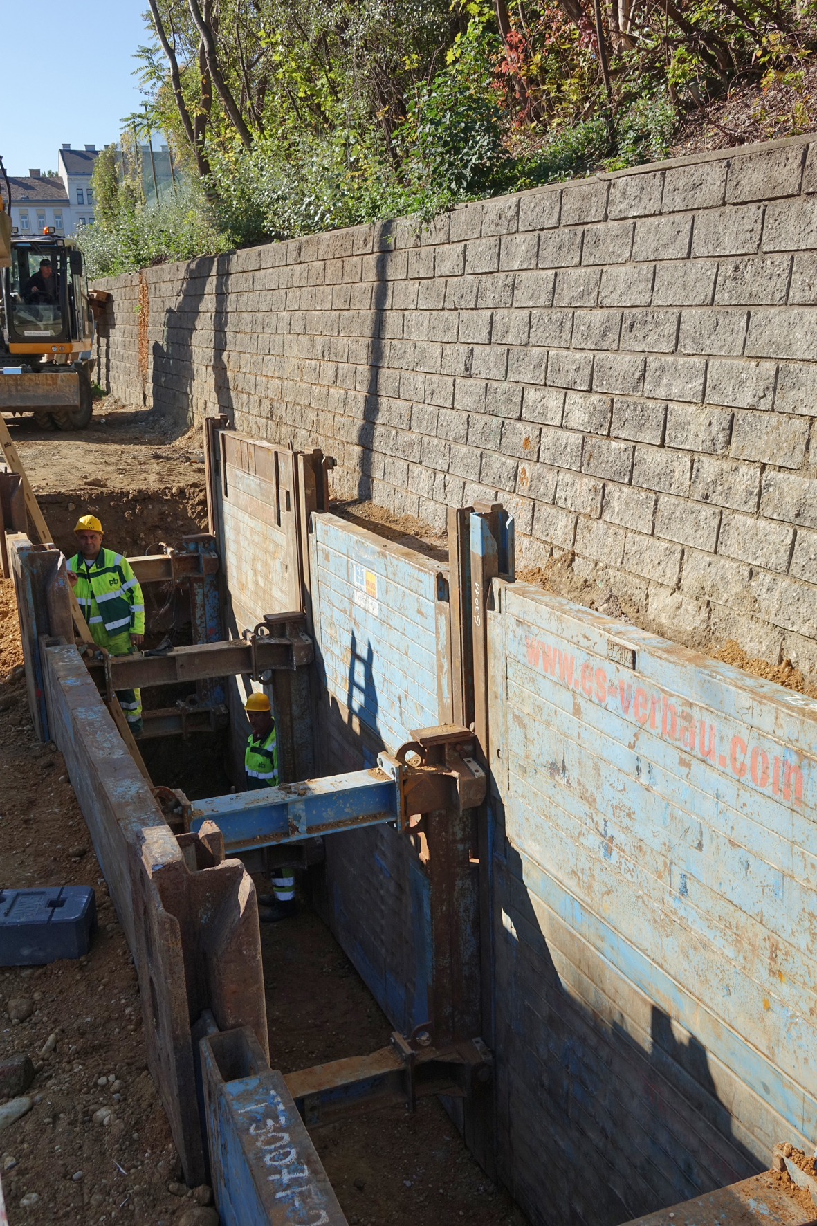 Da diese neue Rohrtrasse auf einer Länge von rund 30 m entlang einer Stützmauer verläuft, ging der Auftraggeber Wiener Wasser, magistratischer Betrieb der Stadt Wien, auf Nummer sicher und forderte in der Ausschreibung ein Verbausystem mit statischem Nachweis. Das mit der Ausführung der Arbeiten beauftragte Unternehmen Pittel+Brausewetter entschied sich für den Linearverbau von Emunds+Staudinger, einer Produktmarke der thyssenkrupp Infrastructure.