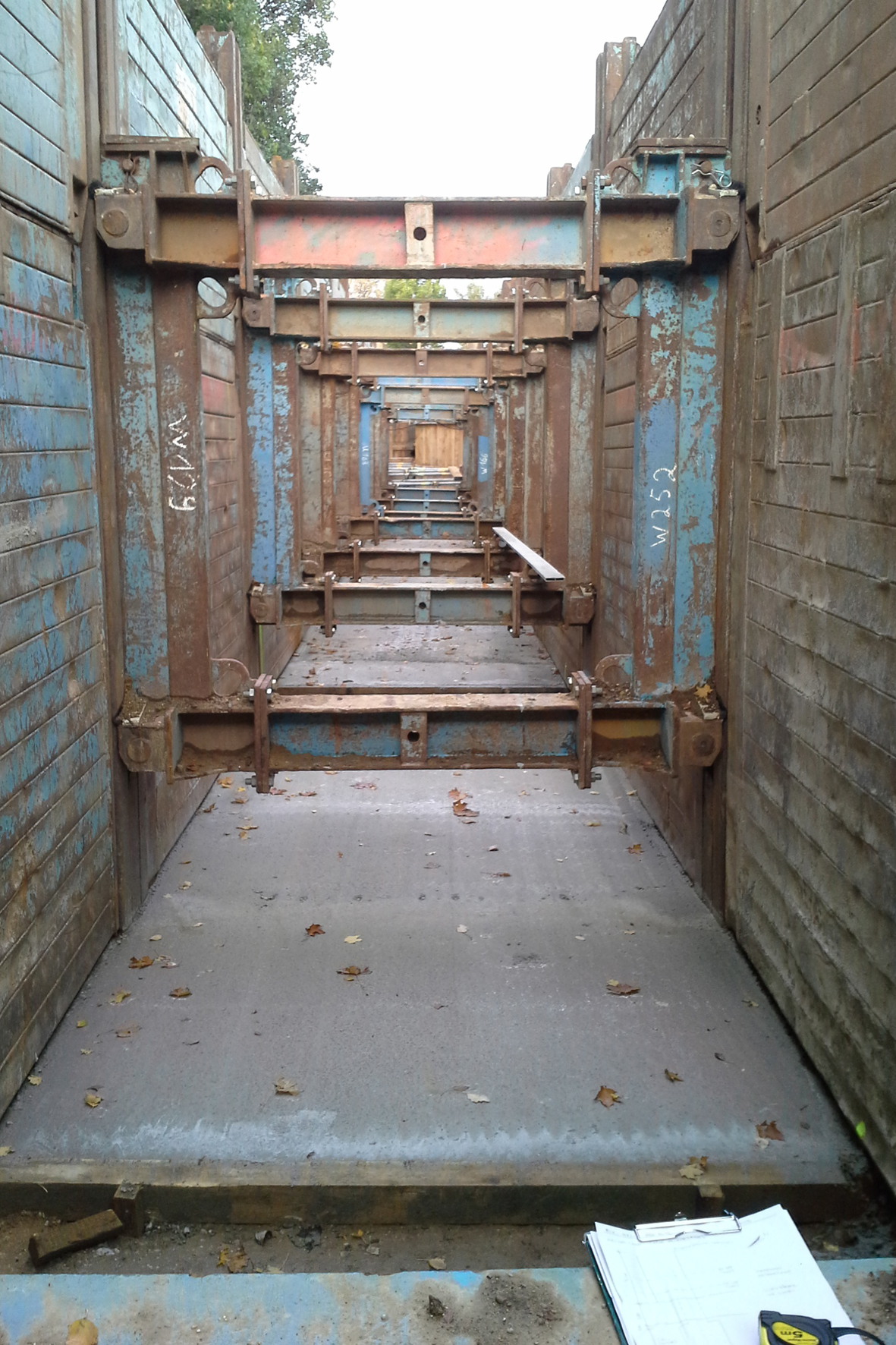 Die außen angebrachte Trägerkonstruktion nahm in dieser Bauphase die komplette Belastung auf. Durch das vergrößerte Einbaufenster ergab sich als zusätzlicher Nutzenfaktor eine noch wirtschaftlichere Rohrverlegung. Für Grabenabschnitte mit querenden Versorgungsleitungen hielt das ausführende Unternehmen zusätzlich ein Modul des sogenannten einschienigen innerstädtischen Linearverbaus vor, der ein Dielenkammerelement zur Führung von Kanaldielen mit den Systembauteilen des Linearverbaus kombiniert.
