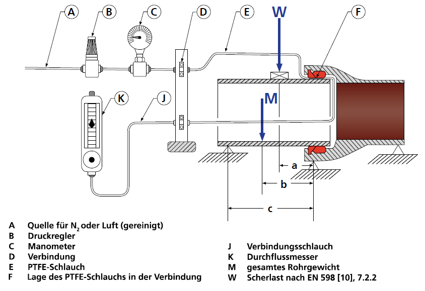 In EN 14741 [13] wird ein Prüfverfahren zur Bestimmung des Langzeit-Dichtverhaltens von Elastomer-Dichtungen durch Extrapolation und Abschätzung des Dichtdrucks nach 100 Jahren beschrieben. Das Verfahren lautet in EN 14741 [13] wie folgt: „Der Dichtdruck in einer Verbindung wird geschätzt durch Messen des zum Anheben der Dichtung erforderlichen Drucks in jedem der drei PTFESchläuche, die gleichmäßig um den Umfang einer Verbindung zwischen Gummidichtung und Außenwand des Spitzendes oder, sofern zutreffend, der Muffe verteilt angebracht sind (Bild 11). In einer Umgebung mit Temperaturregelung und in zunehmenden Zeitabständen wird Stickstoff oder Luft mit einer konstanten Durchflussgeschwindigkeit von 120 ml/min durch drei biegsame PTFESchläuche gepresst. Der für das Erreichen dieser Durchflussgeschwindigkeit erforderliche Stickstoff- oder Luftdruck p wird gemessen. Der Druck pt wird innerhalb eines Zeitraumes in zunehmenden Zeitabständen gemessen. Die extrapolierten Regressionslinien für pt werden verwendet, um die geschätzten Werte px nach 100 Jahren und py nach24 h zu errechnen.“