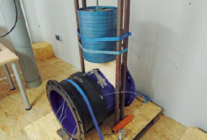 Mit dem hier dargestellten Verfahren wurden Untersuchungen zur Abschätzung des Dichtdrucks an Steckmuffen-Verbindungen, System TYTON®, der Nennweiten DN 200 und DN 400 durchgeführt [16]. Den realen Versuchsaufbau zeigen die Bilder 15 und 16.