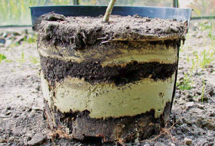 Den Einfluss der Porenräume auf das Wurzelwachstum veranschaulichen die Bilder 3 bis 6. Für die in den Bildern 3 bis 5 dargestellten Versuche im Botanischen Garten der Ruhr-Universität Bochum wurde eine künstliche Schichtung von zwei Substraten mit unterschiedlicher Porosität in Pflanzgefäßen angelegt. Als Substrat mit hohem Porenanteil und guter Durchwurzelbarkeit wurde Komposterde ausgewählt, wie sie für die Containerkultur im Botanischen Garten der Ruhr-Universität Bochum eingesetzt wird. Für die Herstellung von Bodenbereichen mit geringem Porenanteil und geringer Durchwurzelbarkeit wurde Bentonit gewählt. Das eingesetzte Material besteht aus Tonmineralien mit einer mittleren Partikelgröße von 0,063 mm. Die geringe Größe der Partikel hat zur Folge, dass die für das Wachstum von Wurzeln notwendigen Räume (Bodenporen) mit einer Größe ab 100 μm nicht vorhanden sind [5]. Die Substrate wurden in horizontalen Schichten wechselweise um eine zentrale Säule aus einem der Substrate eingebracht. Den Schichtaufbau veranschaulicht der dargestellte schematische Längsschnitt in Bild 3. Bild 4 zeigt ein seitlich geöffnetes Pflanzgefäß.