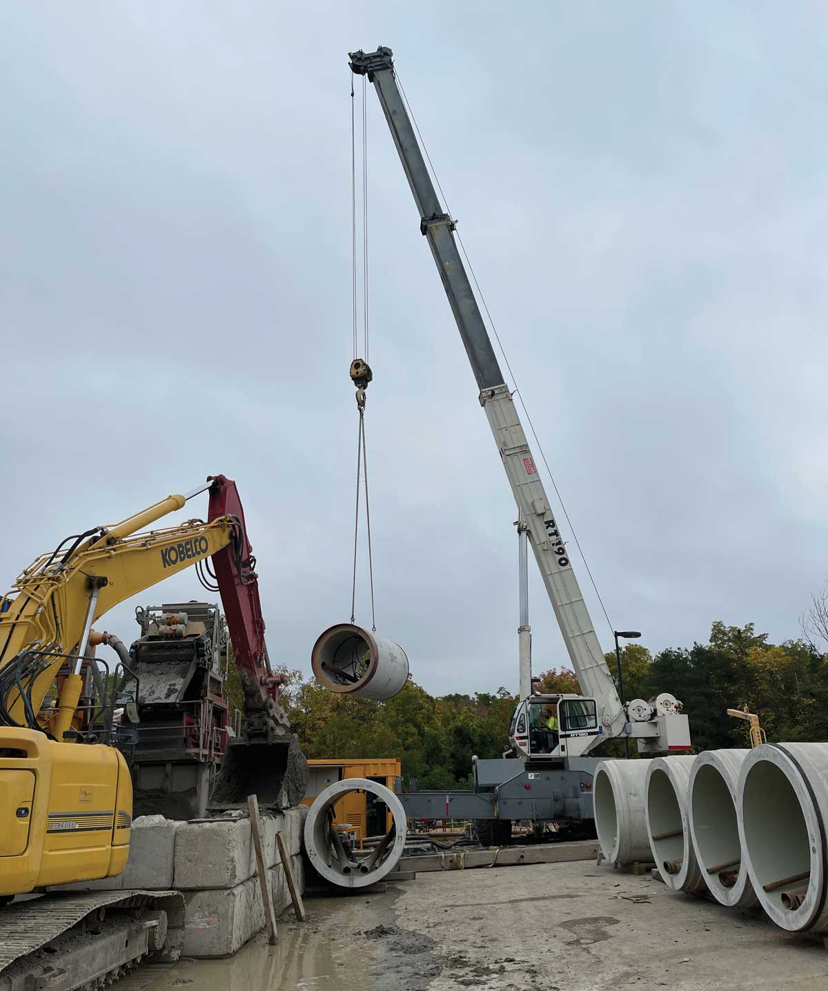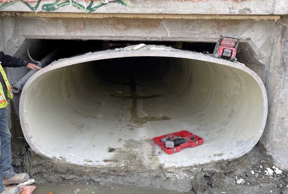 The final design utilized a section with 2.66 m internal span, 1.33 m internal rise, 48 mm wall thickness, and provided a reduction in waterway area of 70 per cent. The FRP liner sections were customized to include elbow pieces to be used at culvert bend locations and pieces with storm sewer outlet connections into the existing culvert. The sections were joined in-situ using bell and spigot joints and connected with an elastomeric sealant. The annular space between the existing culvert and the FRP liner was grouted using a low-density flowable cellular grout.