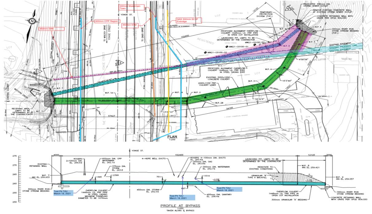 The overflow tunnel consisted of a 1.5-m inside diameter pre-cast concrete overflow pipe with HDPE liner and was constructed using micro-tunneling technology. Microtunnelling was proposed by the drilling contractor – Ward & Burke Construction Ltd. – as it has a high degree of alignment control and minimizes settlement/ground loss during installation with pressurized slurry at the tunnel excavation face. These factors were extremely important as the tunnelling operations were required to avoid several utilities and have no impact to traffic on Yonge Street above.