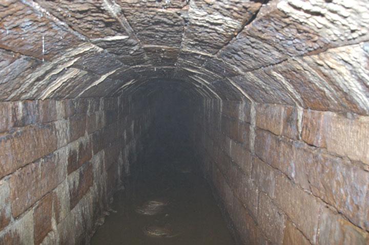 Der Bahndurchlass in den Abmessungen 1250/1650 mm ist über eine Länge von 52 m mit senkrechten Seitenwänden und einem Gewölbe vollständig aus Natursteinquadern (s. Bild 1) und einer Sohle aus Kanalklinkern ausgebildet. Die Sohltiefe beträgt ca. 4,0 m unter GOK.