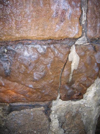Im Rahmen der Begehung durch S & P im April 2007 wurde der Ist-Zustand des Bahndurchlasses aufgenommen: Die vorhandenen Schäden waren korrodierte Mörtelfugen (s. Bild 2), Inkrustationen oberhalb des Kämpfers und eine teilweise unebene und ausgebrochene Sohle. Darüber hinaus wurden mehrere Querrisse mit Rissbreiten von bis zu 4 cm festgestellt, die über den gesamten Umfang verliefen. (s. Bild 3).