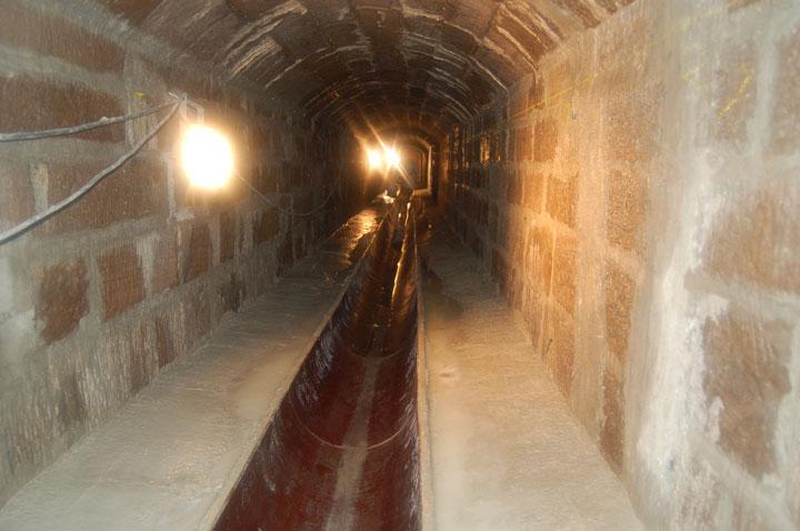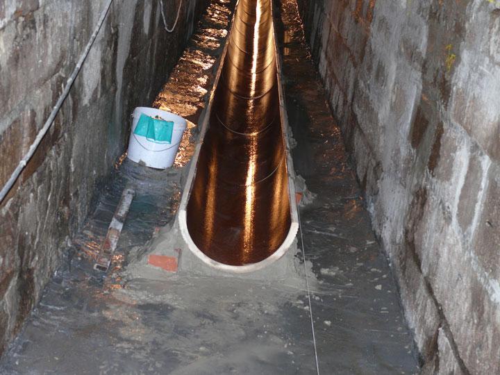 Nach der Grundreinigung des Bahndurchlasses mit Wasserhochdruck bis 500 bar wurden im ersten Arbeitsschritt alle korrodierten Fugen bis auf den festen Fugenhintergrund ausgeräumt. Anschließend wurden die Risse aufgestemmt und verdämmt. Die Rissinjektion erfolgte über Injektionspacker mit einem Injektionsdruck bis maximal 10,0 bar. Als Injektionsmittel wurde eine Zementsuspension eingesetzt Die dahinter liegenden Hohlräume wurden in gleicher Weise verfüllt. Die Inkrustationen wurden abgestemmt und mit dem losen Fugenmaterial im Wandungsbereich ausgeräumt. Nach der Neuverfugung wurden die Sohle nivelliert und die Ausbrüche im Sohlenbereich aufgearbeitet. Der Einbau einer Steinzeughalbschale DN 400 erfolgte mittig (s. Bild 6) mit beidseitiger Berme aus Beton C25/30. Die Auftritte wurden mit einem kunststoffmodifizierten und abwasserbeständigen Mörtel beschichtet. Im Fugenbereich wurden Injektionsschläuche eingebaut und mit einem Injektionsharz verpresst.