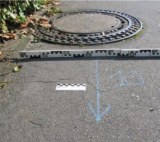 Undichtigkeiten im Schmutz- oder Regenwasserkanal, deren Ursachen z. B. auf Riss- und Scherbenbildung, auf undichte Muffenverbindungen oder Muffenversätze zurückzuführen sind, verursachen häufig die Infiltration von Boden und/oder Verfüllmaterial in das Rohr. Auf diese Weise kommt es zu Setzungen und Sackungen, die sich durch die Verkehrsflächenbefestigung bis zur Fahrbahnoberfläche auswirken können. Sie sind an der Fahrbahnoberfläche in Form von Unebenheiten, Rissbildung oder Flickstellen feststellbar. Das Vorhandensein derartiger Fahrbahnschäden kann jedoch nicht grundsätzlich auf Schäden im Kanalnetz zurückgeführt werden, da auch andere Schadensursachen vorliegen können. Die in den nachfolgenden Abbildungen dargestellten Kanalnetz- und Straßenschäden traten hingegen unmittelbar über- bzw. untereinander befindlich auf, sodass eine Interaktion vermutet werden kann. Derartige Schadenszusammenhänge sind der primären, überwiegend aber der sekundären Interaktion zuzuordnen.