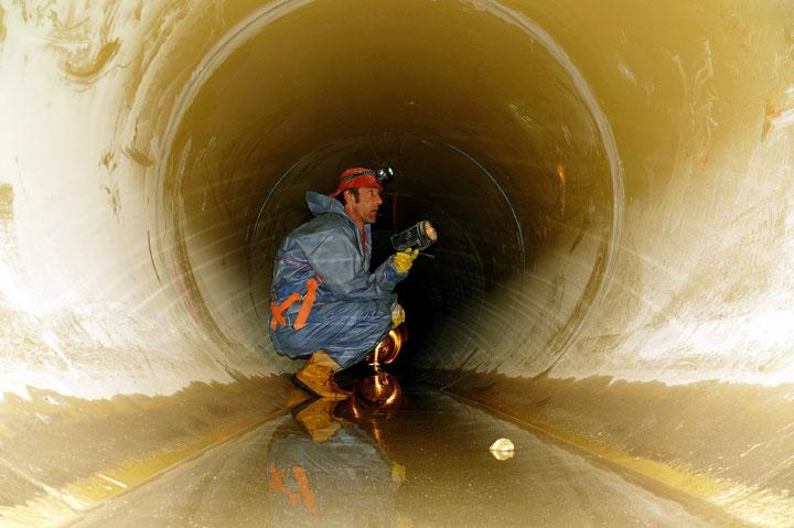 Grundsätzlich günstig für die Bauorganisation war die doppelsträngige Ausführung des Rothebach-Dükers. So konnte jeweils ein Rohr den Betrieb übernehmen, während das andere saniert wurde. Nachdem die Weströhre Ende Februar fertiggestellt wurde, stand im zweiten Bauabschnitt der östliche Düker auf dem Programm. Zuvor musste er in einer mehrtägigen Reinigungsaktion von den Sedimenten befreit werden, die sich während der Sanierungsphase darin abgelagert haben.