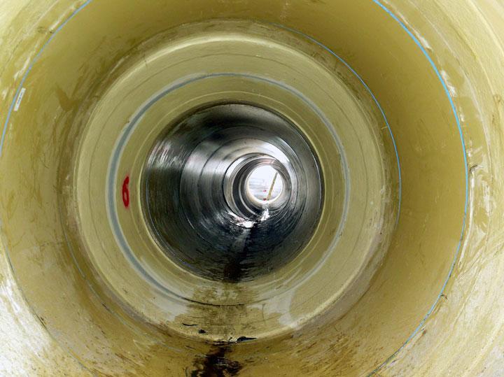 Den planerischen Überlegungen unter Projektleiterin Dipl.-Ing. Dorothee Schütte kam entgegen, dass der Düker in seiner Kapazität recht großzügig bemessen ist. So konnten grabenlose Sanierungsoptionen in Betracht gezogen werden, die eine Reduzierung von Rohrquerschnitt und hydraulischer Kapazität mit sich bringen. Angesichts der statischen Dauerlasten auf den Röhren entschied man sich nach genauer Kalibrierung der Düker-Röhren für ein Relining mit GFK-Rohrmodulen DN 1600. Die GFK-Großrohre sind nicht nur bautechnisch leicht zu handhaben, sondern statisch extrem belastbar und hoch widerstandsfähig gegen Korrosion und Abrieb: Ideale Voraussetzungen für eine langfristige Sanierungslösung. Mit der Durchführung der Baumaßnahmen wurde nach einer beschränkten Ausschreibung im öffentlichen Teilnahmewettbewerb die KUT Kanal- und Umwelttechnik, Niederlassung Gelsenkirchen, beauftragt, die von August 2007 bis Mai 2008 insgesamt 88 Rohrmodule von Hobas, Neubrandenburg, installierte. Die jeweils rund 400 Kilogramm schweren Rohre wurden mit einem Fahrzeugkran über das geöffnete Düker-Oberhaupt in den Untergrund hinab gelassen und dann von einem elektrisch angetriebenen Rohr-Shuttle an den Einbauort transportiert; über Steckmuffenverbindungen fügte man die Rohre dort zusammen. Einem schnellen Bauvollzug standen im feuchten Sommer und Herbst 2007 die ungünstigen Wetterbedingungen im Wege: Die Baumaßnahmen im westlichen Düker mussten sechsmal unterbrochen werden, weil Hochwasser der Lippe in den Düker zurückstaute. Das unterbrach zwar den Bauablauf, stellte ansonsten allerdings kein Problem dar, da das im Düker mit Abstandhaltern fixierte Reliningrohr problemlos geflutet werden konnte. Nach erfolgreicher Dichtheitsprüfung des neuen Dükerrohrs wurde abschließend der Ringraum zwischen Alt- und Neurohr verdämmt.