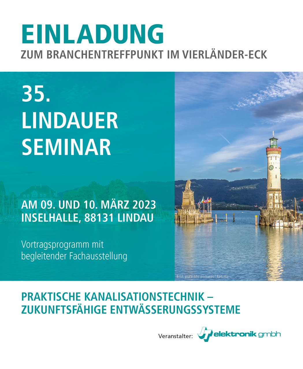 Seit Ende der 1980er Jahre hat sich die Veranstaltungsreihe Lindauer Seminar immer weiterentwickelt. Mit rund 500 Teilnehmern und über 70 ausstellenden Firmen stellt das Lindauer Seminar heute mit das größte und bedeutendste deutschsprachige Fachforum für die Siedlungsentwässerung dar. Das Format richtet sich sowohl an Berufseinsteiger als auch an langjährig Erfahrene und bietet auch deshalb einen nachhaltigen Mehrwert. Das Lindauer Seminar findet unter Berücksichtigung der dann aktuell geltender Corona-Regelungen statt und wird von Ingenieurkammern gemäß deren Fort -und Weiterbildungsordnung anerkannt. Kontakt für weiterführende Informationen: Dipl.-Kffr. Sonja Jöckel, Telefon 08382 967360, Email: sonja.joeckel@jt-elektronik.de und: www.jt-elektronik.de mit Anmeldemöglichkeit.