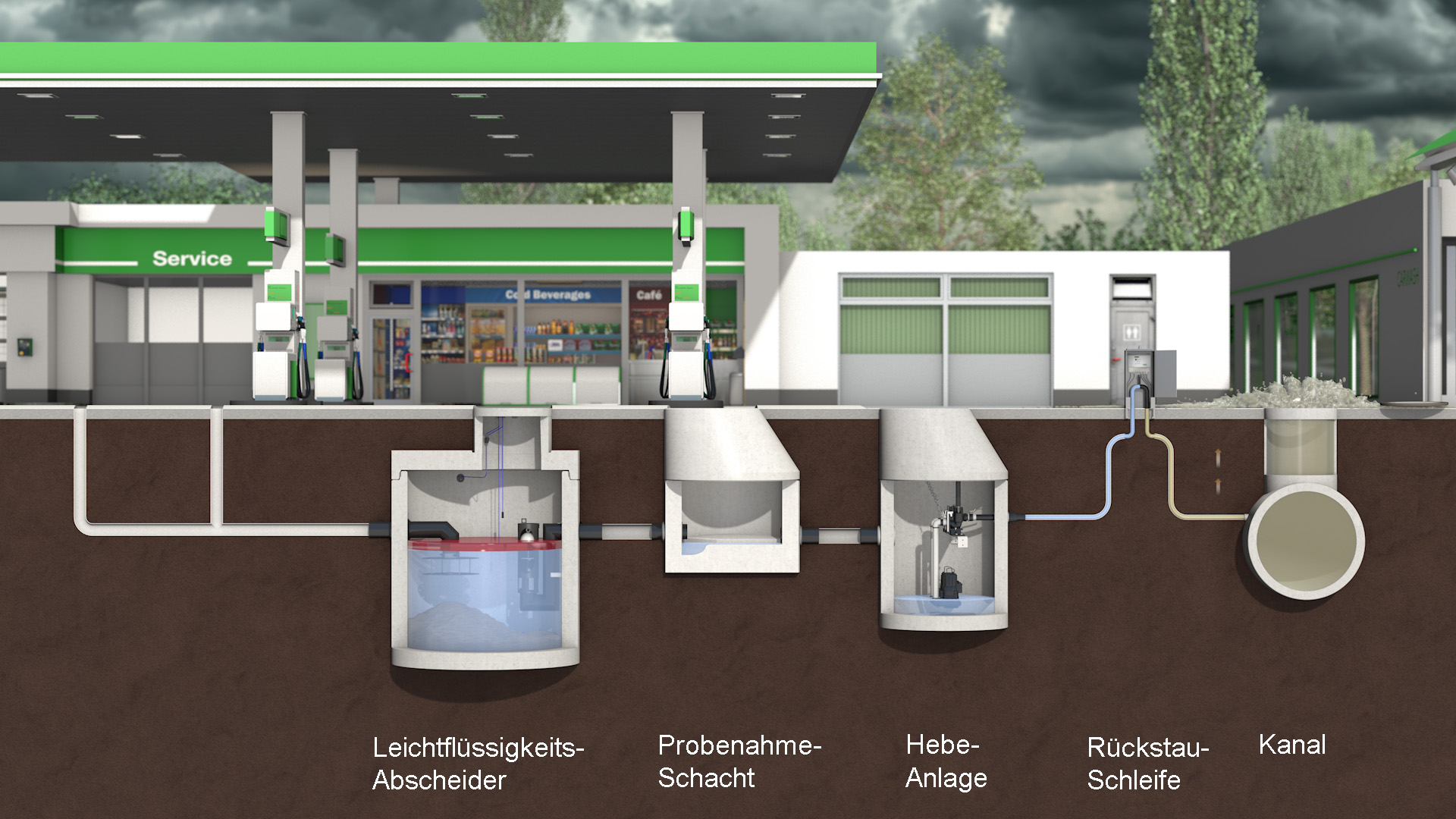 Tankstellen, Waschstraßen und andere Gewerbe- und Industriebetriebe benötigen eine Abscheideranlage. Diese verhindert, dass Abwasser, das Leichtflüssigkeiten enthält, unbehandelt in die öffentliche Kanalisation gelangt. Bei der Auslegung und Planung von Leichtflüssigkeitsabscheidern sind einige Vorgaben zu beachten, unter anderem Schutz und Sicherheit bei Rückstauereignissen im örtlichen Kanal.