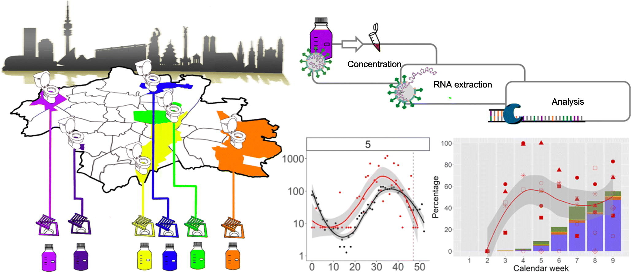 In ihrer Untersuchung im Raum München sammelten die Wissenschaftlerinnen und Wissenschaftler seit Anfang April 2020 über ein Jahr lang wöchentlich Abwasserproben an sechs Standorten im Münchner Stadtgebiet. Die Proben wurden im Labor mittels RT-PCR (reverse transcription polymerase chain reaction) und Genomsequenzierung untersucht, um die Verbreitung von SARS-CoV-2 in München im zeitlichen und räumlichen Verlauf zu messen. Durch die Entschlüsselung des Erbguts anhand der Sequenzierung isolierter Virus-RNA erhielten die Forscher zudem Informationen, ob in den Proben besorgniserregende Virusvarianten (variants of concern, VOC) auftraten.